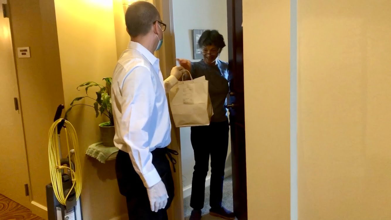 With the main dining room no longer in use, it quickly became a storage space for extra supplies, specifically to-go containers. Another area converted into a delivery assembly line, keeping production in the kitchen as normal as possible. The Hostess Stand became a call/customer service center where employees took orders and answered questions. The bar closed, too, which prompted Clare Bartender Jackie Milano to take her services on wheels. Every night, she delivers glasses of wine and specialty drinks to residents at their doors.
